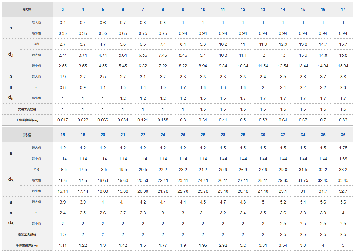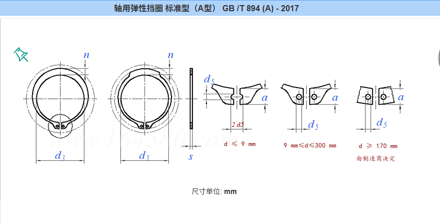 GB /T 894 (A)-2017标准型(A型)轴用弹性挡圈是一种安装于槽轴上,用作零件定位和固定等的零件,以下是常见的轴用弹性挡圈尺寸表(部分数据,单位:mm):