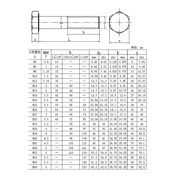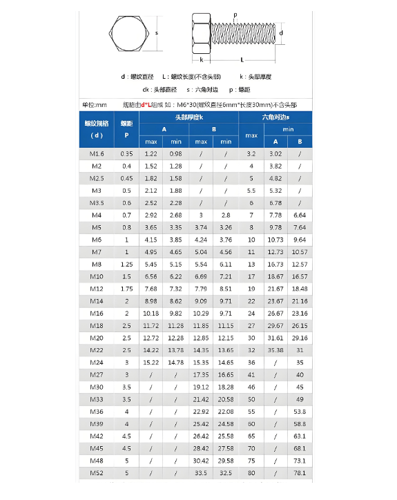 螺纹规格(M) 螺距(mm) 公称长度范围(mm) 对边宽度(s,mm) 头部厚度(k,mm)
