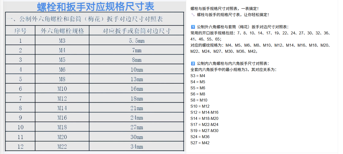 螺栓与扳手规格尺寸对照表,一表搞定: