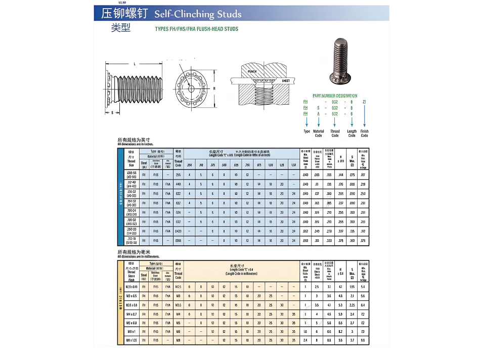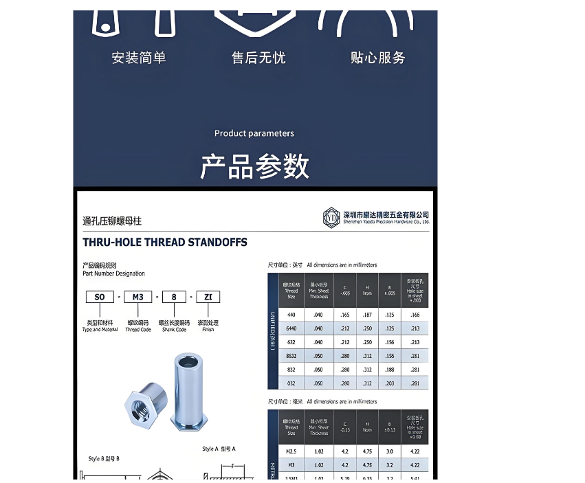 头部尺寸:头部有不同形状(如圆形等),其直径和厚度等尺寸也有相应标准规定。例如头部直径一般会比螺纹公称直径大,以提供足够的压铆接触面积,保证压铆后的牢固性。