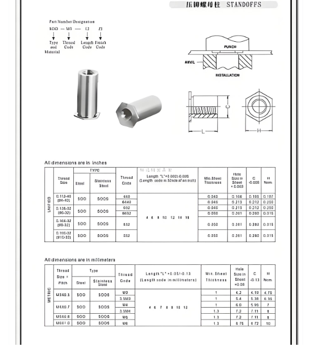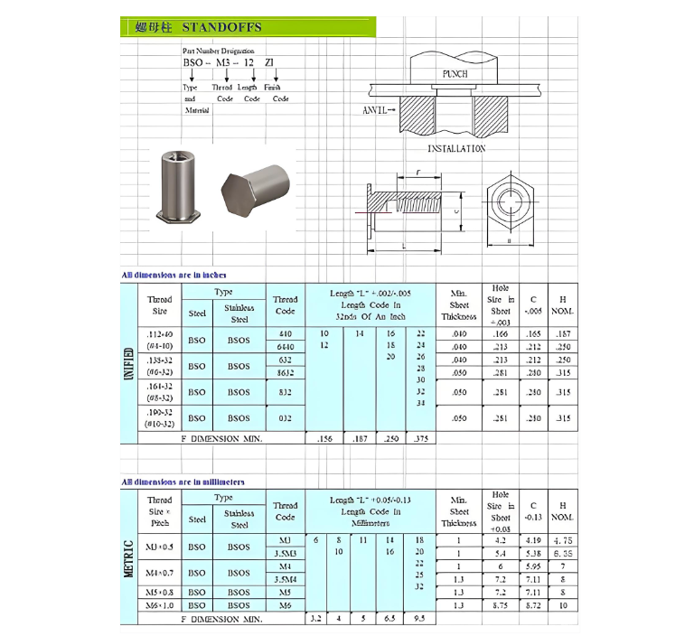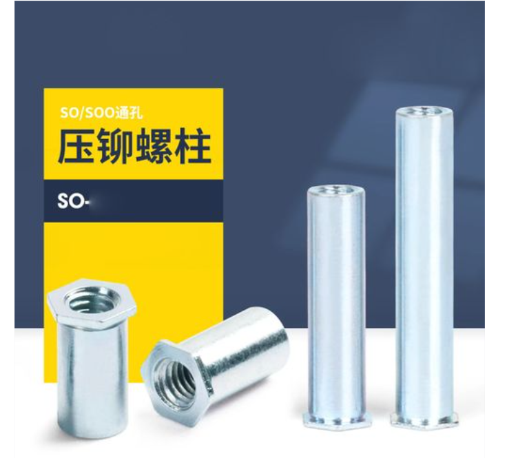 不锈钢:不锈钢材质的用BSOS表示,常见的不锈钢材质有304、316等。不锈钢压铆螺柱具有良好的耐腐蚀性和抗氧化性,适用于对耐腐蚀要求较高的环境,如食品加工、医疗器械、化工设备等领域。