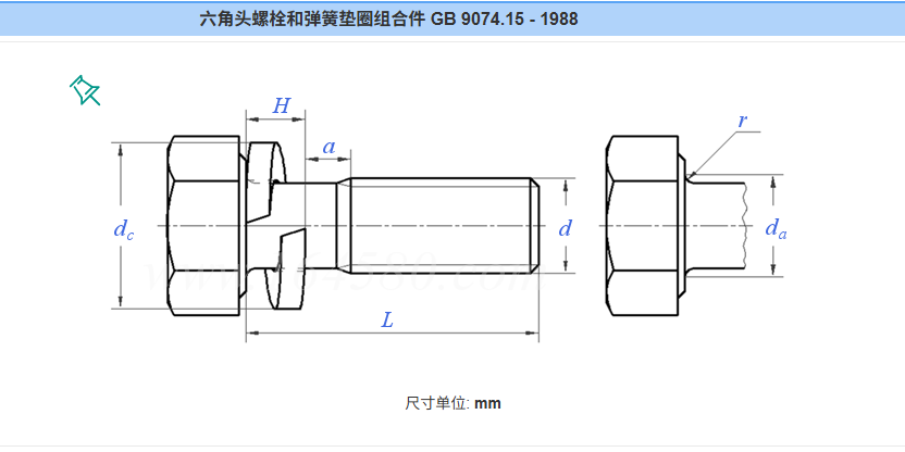 GB 9074.15-1988 适用于 螺纹规格 M3~M12 的六角头螺栓与弹簧垫圈组合件(外搜信息)。