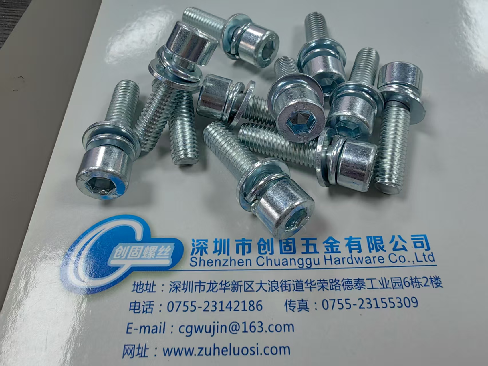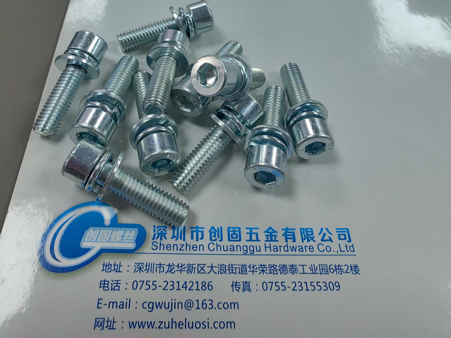 深圳市创固五金厂家专业生产销售10B21材质 8.8级圆柱头内六角平弹垫圈三组合螺栓GB70.1 M8*30 镀环保蓝白锌 内六角三合一螺丝生产制造厂家 内六角杯头三合一组合件生产厂商 联系方式:朱经理 15818603477 微信同号 QQ:956914748