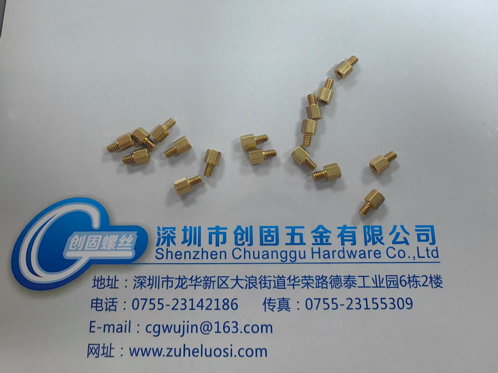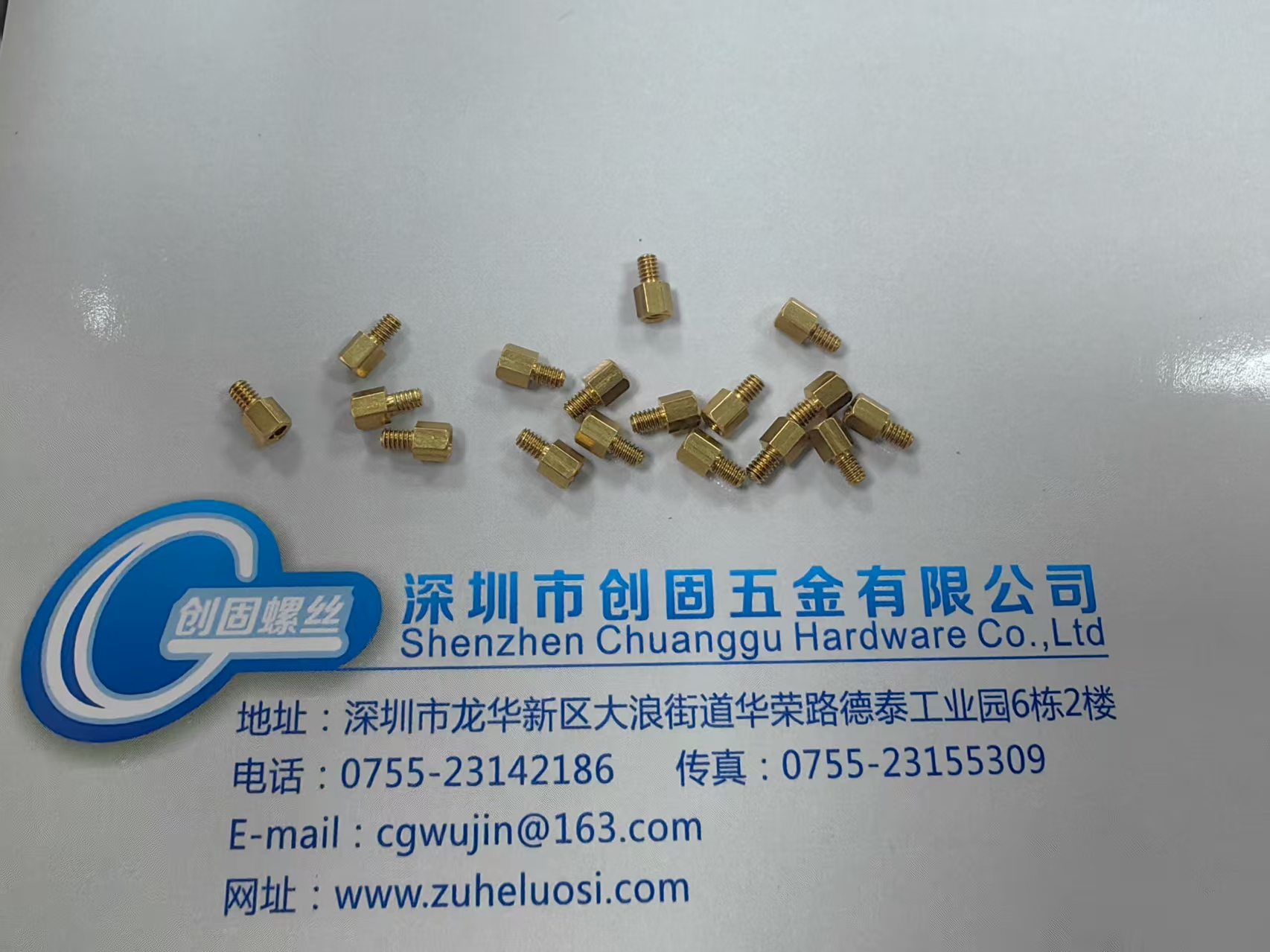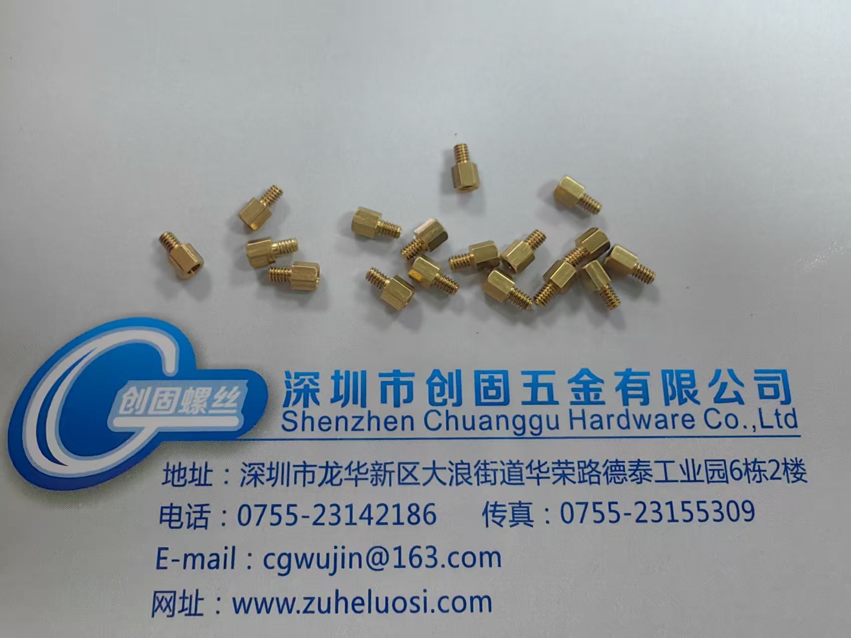 深圳市创固五金厂家专业生产销售六角铜柱M2*3+3 黄铜H59 H62 H65 联系方式:朱经理 15818603477 QQ:956914748 微信与手机同号。
