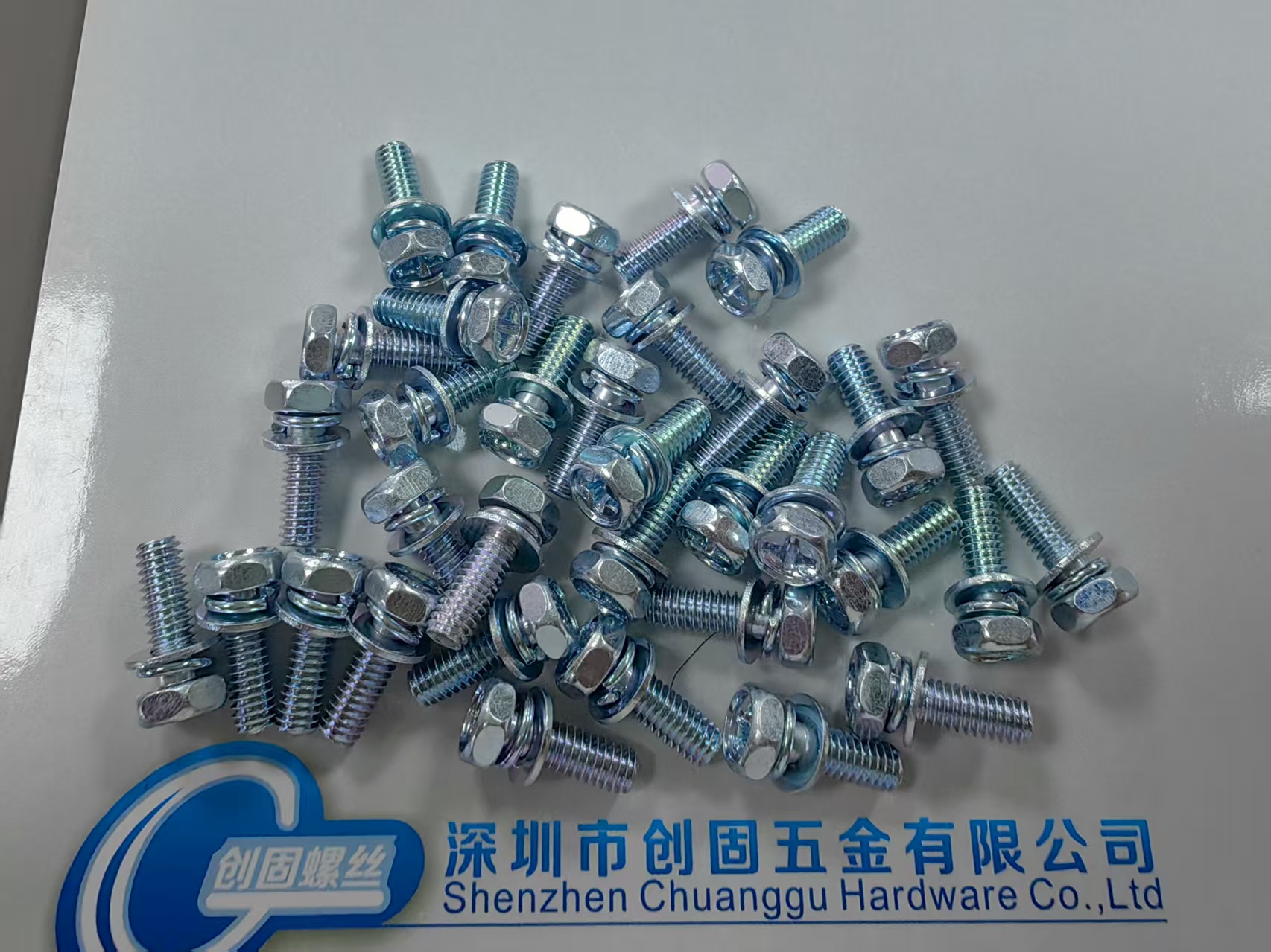 十字六角组合螺钉供应商家 304外六角三组合螺丝生产厂 深圳市创固五金厂家专业生产销售304不锈钢外六角十字槽弹平垫圈三组合螺钉GB9074.13联系方式:朱经理 15818603477 微信同手机号