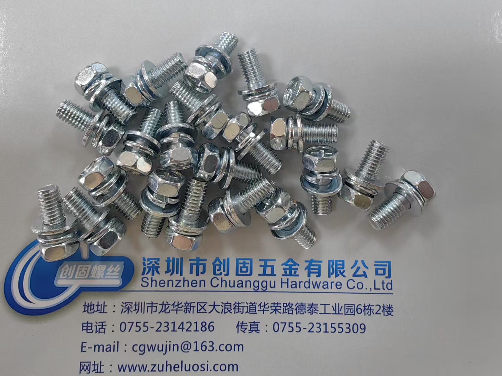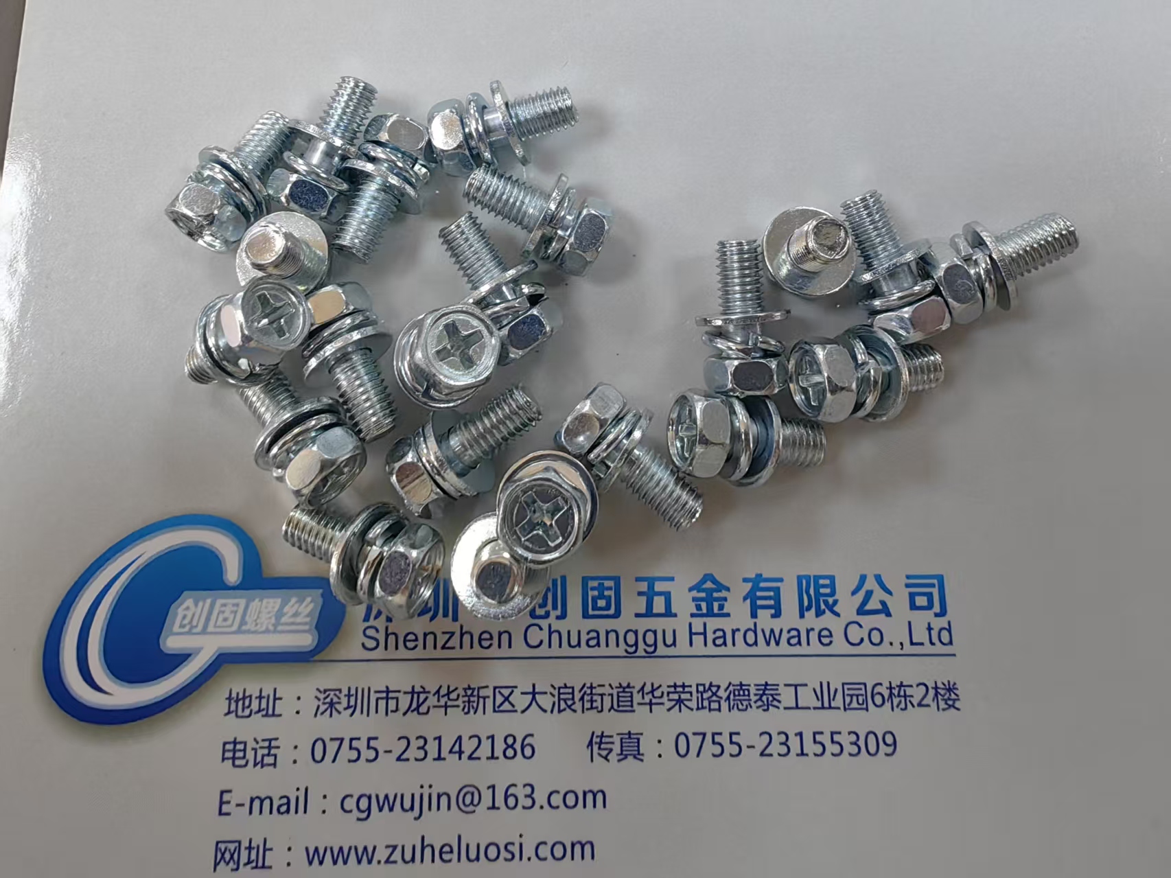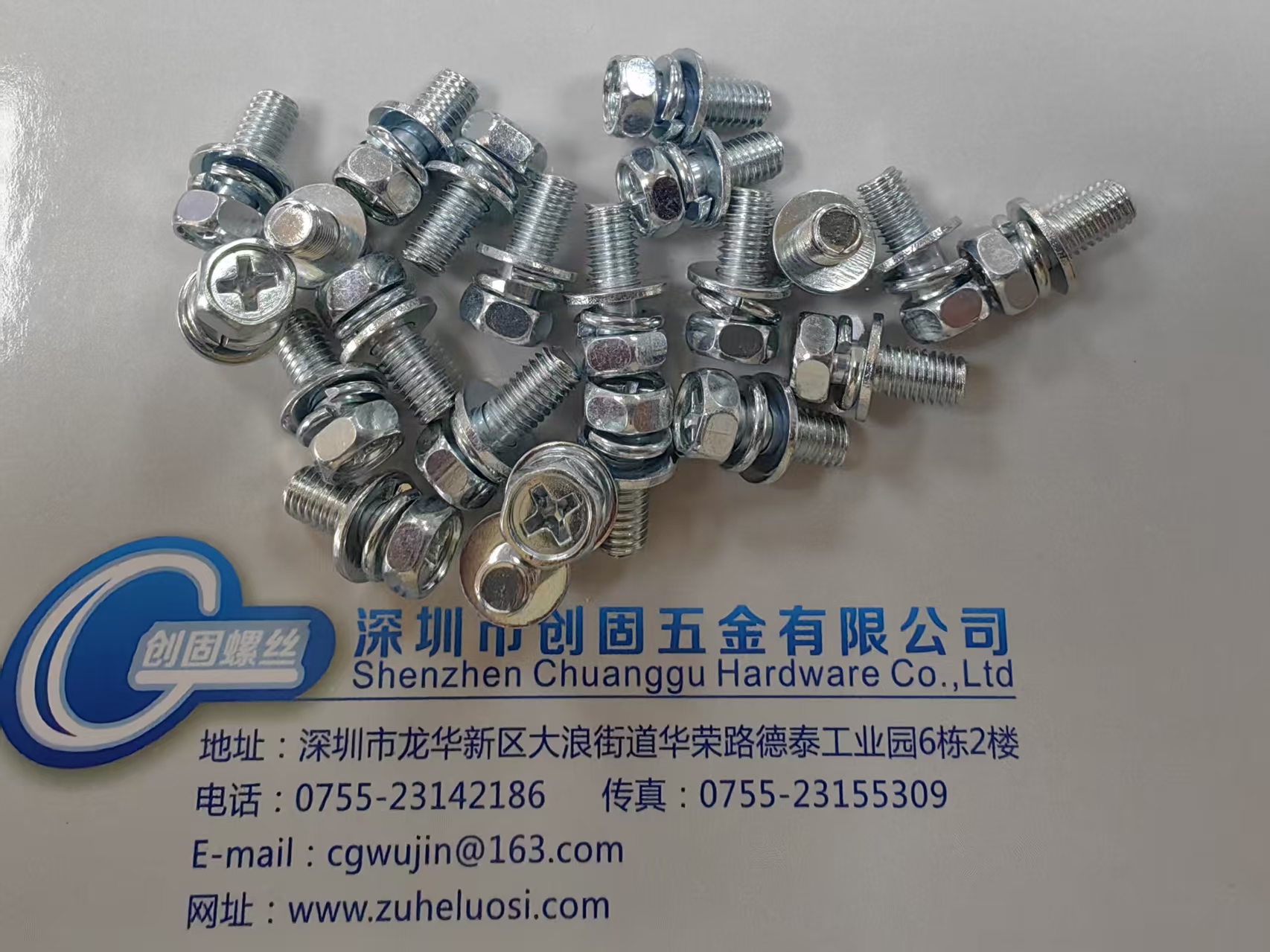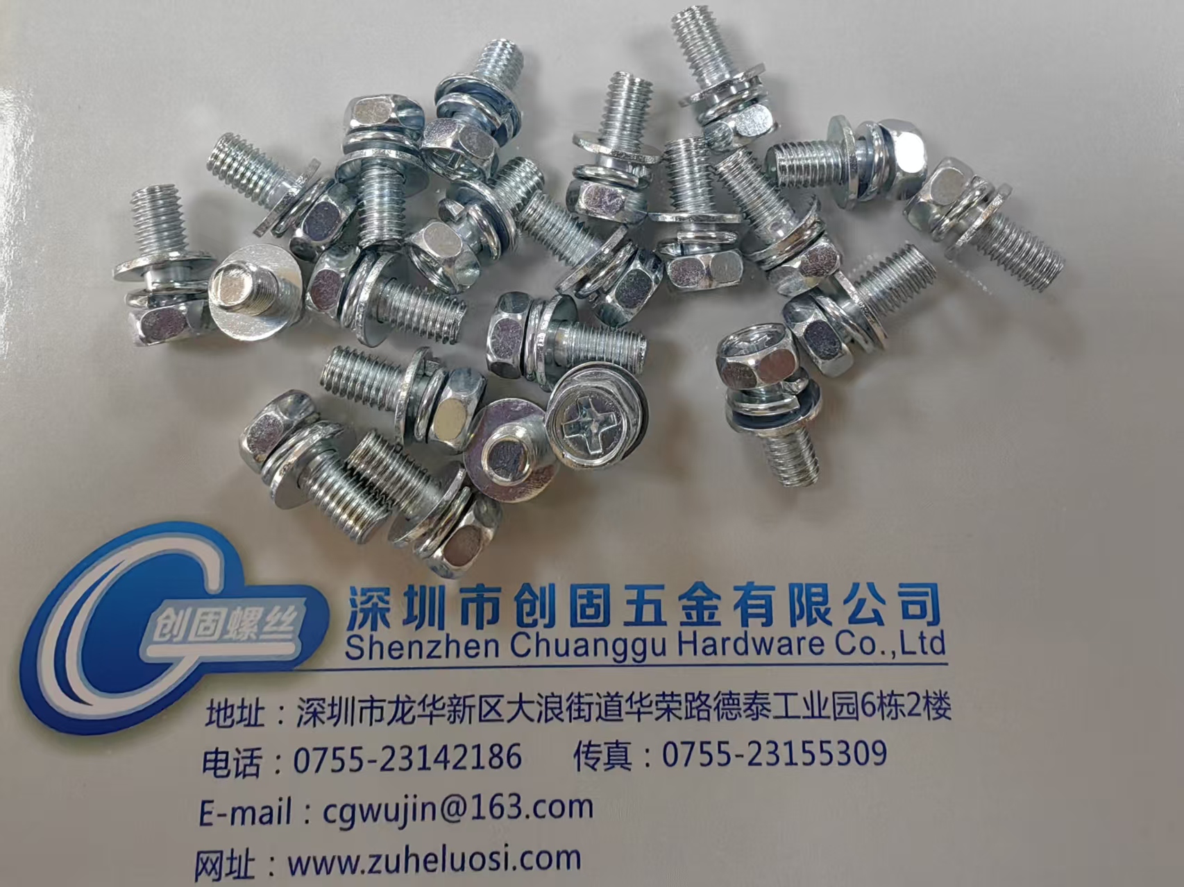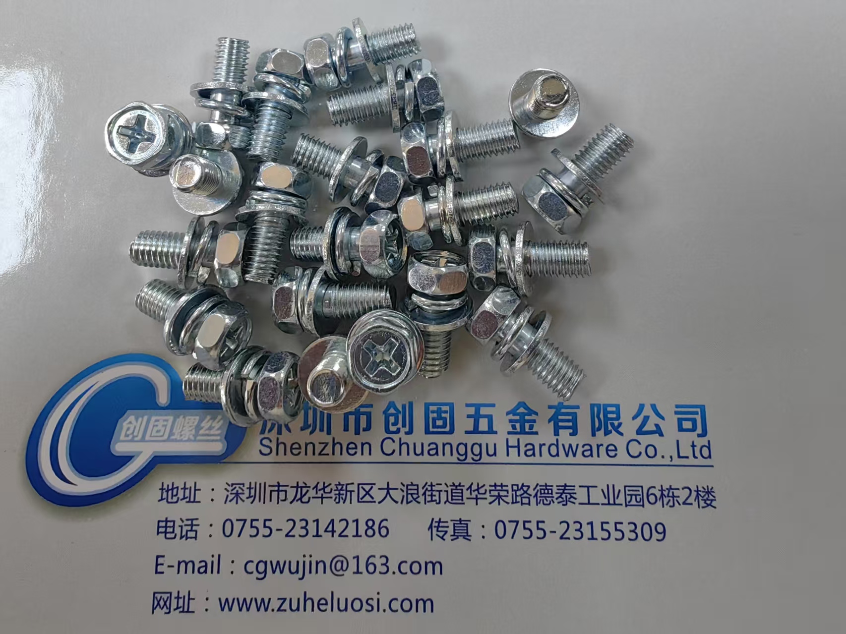 8.8级十字槽外六角三组合螺丝GB9074.13 M5*12 镀环保彩锌 深圳市创固五金厂家专业生产销售高强度8.8级六角头凹穴十字槽弹平垫圈三组合螺栓 联系方式:朱经理 15818603477 微信同手机号 常用规格均有现货。